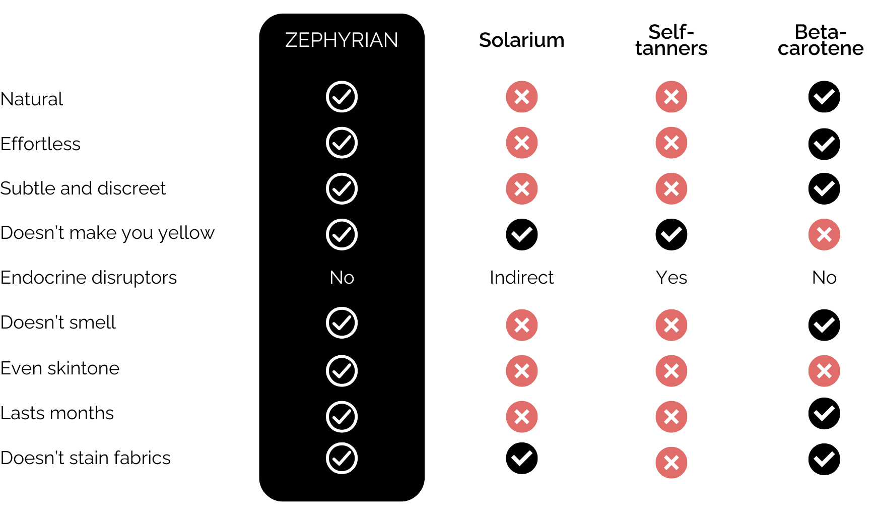 About the safest option you can choose for tanning and skincare. Instead of covering your face with synthetic ingredients derived from the petroleum industry, or damaging your sensitive skin with the UV rays of a solarium, Zephyrian works from within. It acts as an extension of a healthy diet, making you look healthy and desirable.
