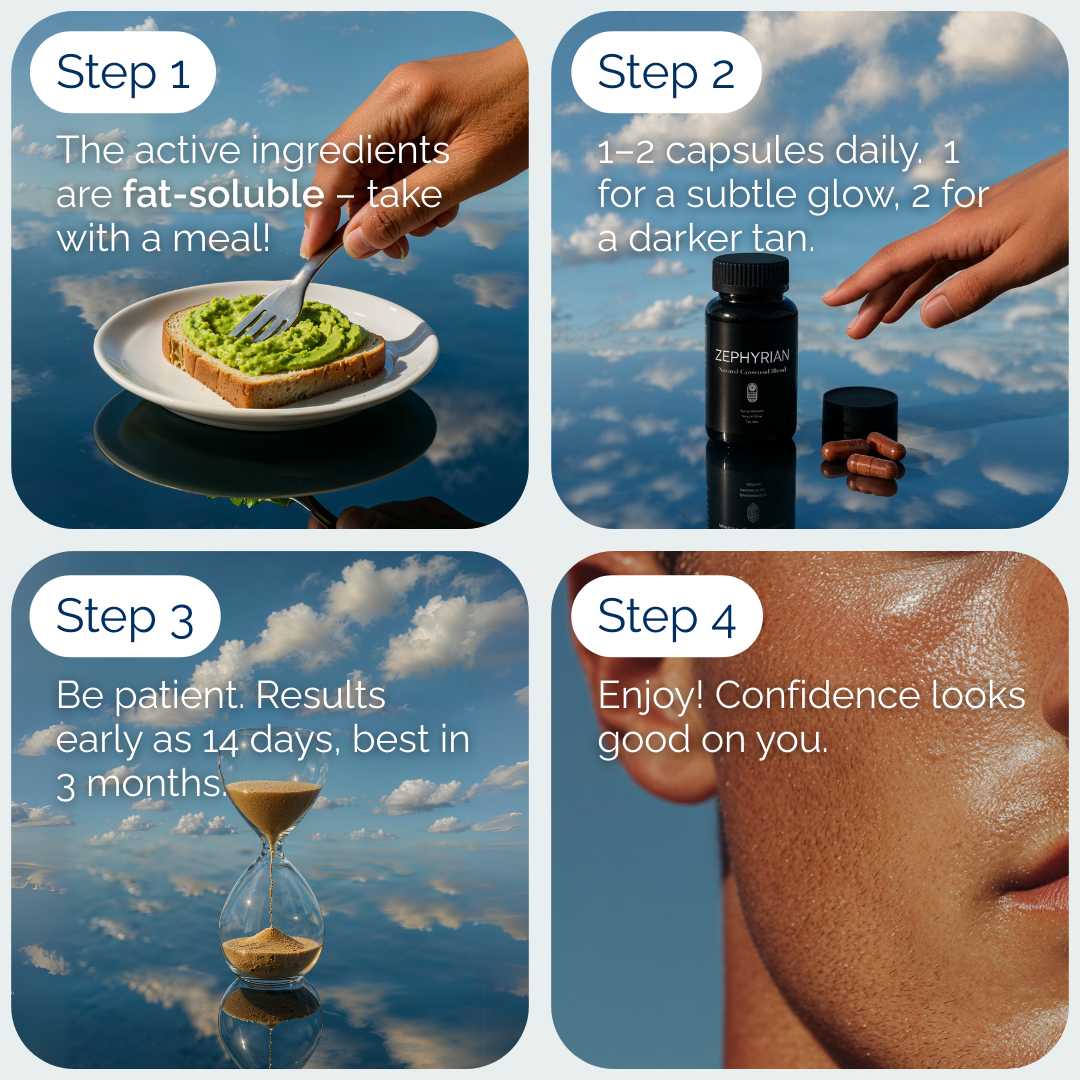 No, you don’t need the sun for Zephyrian to work! The carotenoids in our formula create a healthy, golden glow that’s separate from melanin production. If you already have a tan, it enhances and deepens it, but even without sun exposure, it gives your skin a vibrant, radiant tone naturally. Just take it daily and enjoy the glow!