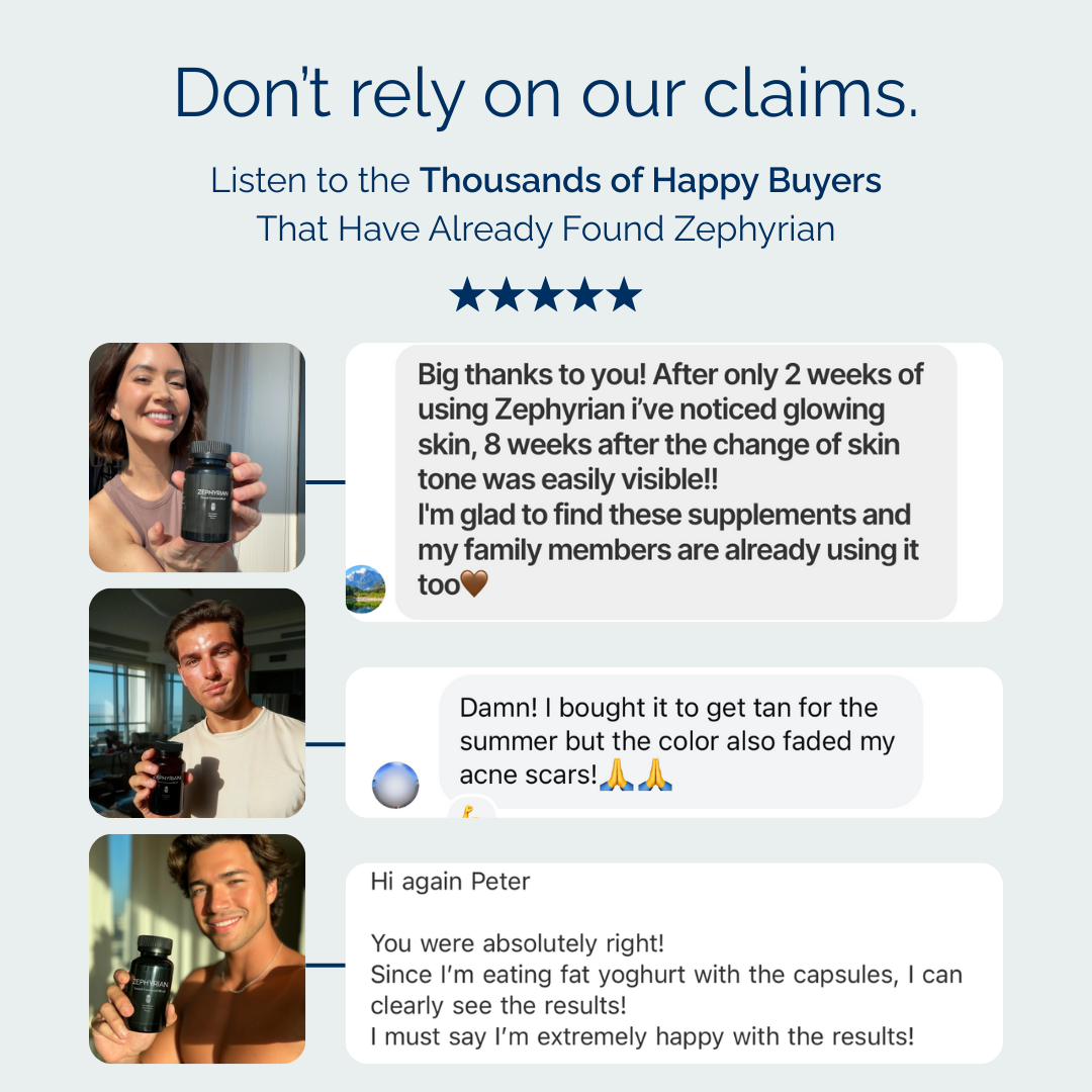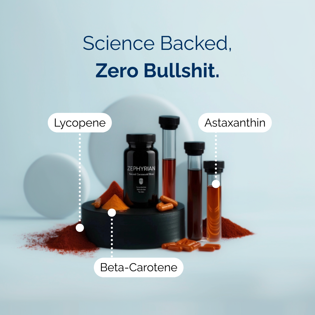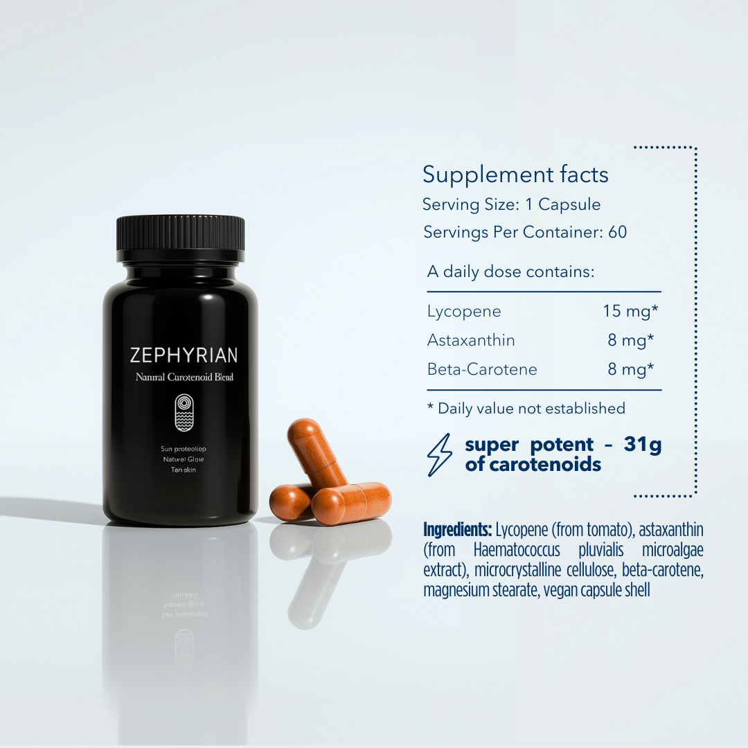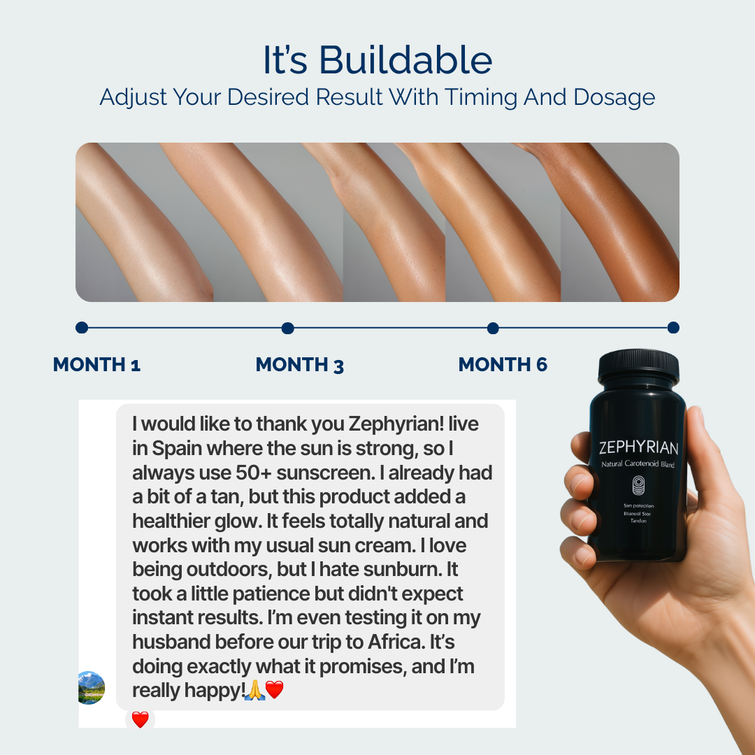 Zephyrian gives you a natural, golden glow even when sunlight is scarce. The carotenoids in our formula work without sun exposure, making it ideal for maintaining a vibrant skin tone during the winter months. Plus, it enhances your complexion and provides a healthy-looking tan all year round, no streaks or patches.