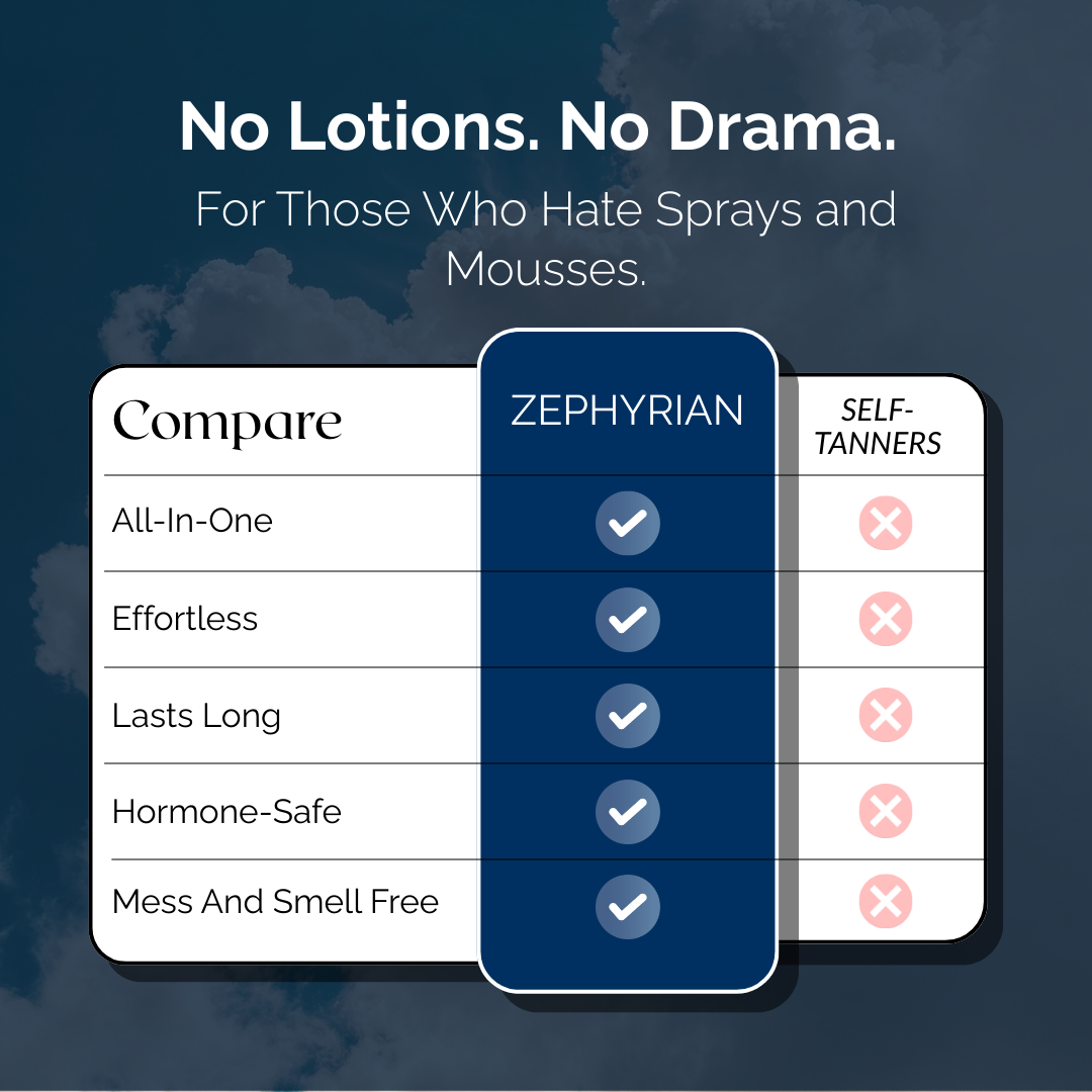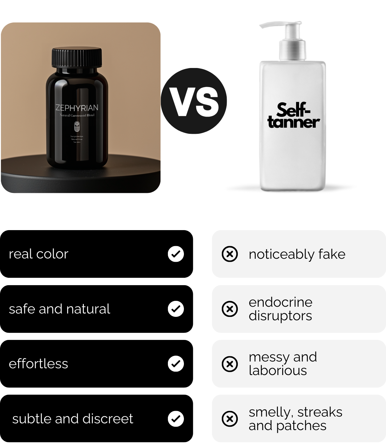 Self-tanners wash off, solariums fade. Both just mask your skin’s true color. Zephyrian works from within, enhancing your natural tone for a glow that’s real and truly yours.